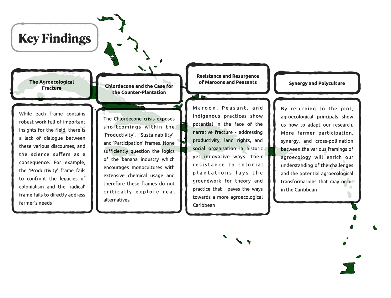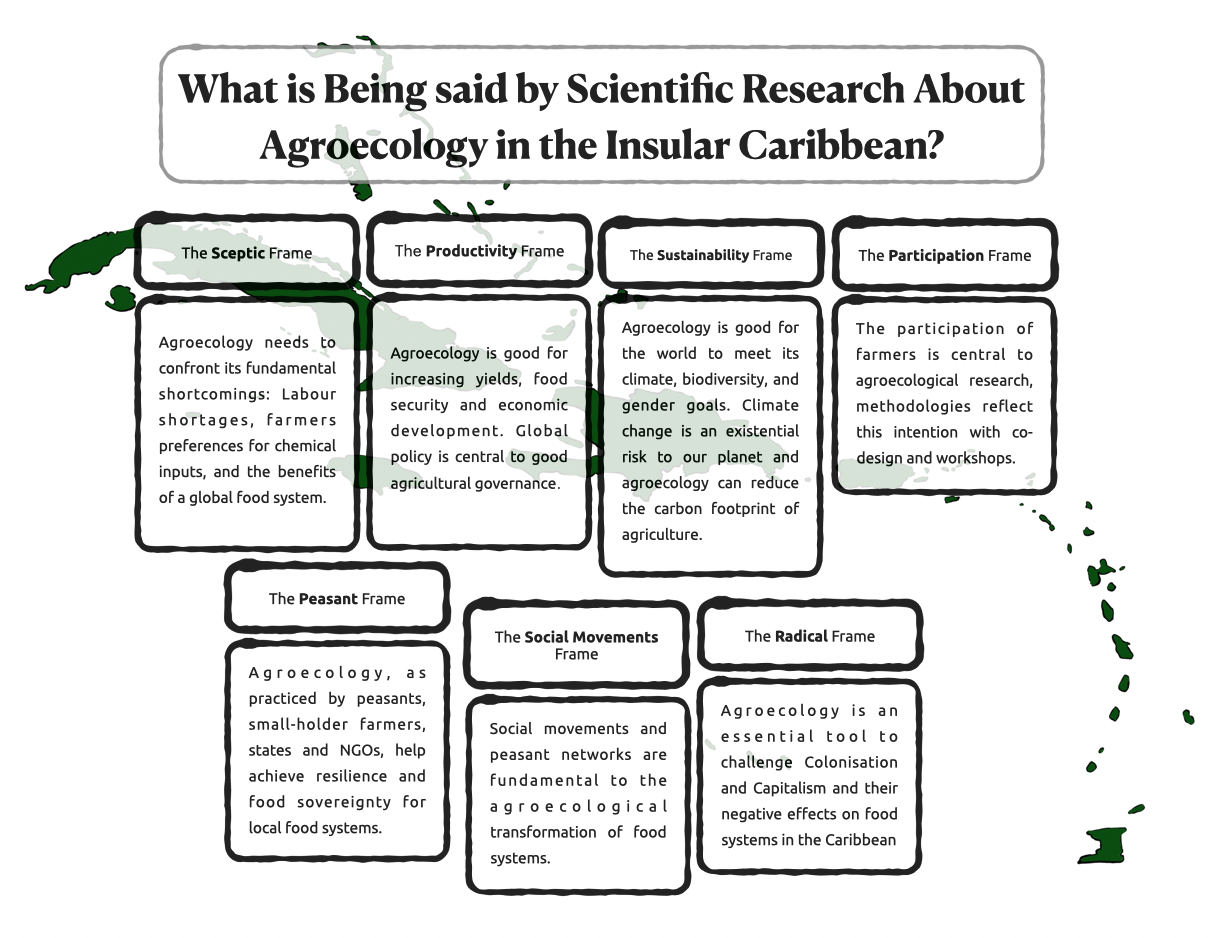 Agroecology, as a set of principles influenced by science, agrarian social movements, and ecological farming practices, has shown that it is possible to design sustainable and resilient food systems across latitudes. Despite its potential to reduce vulnerabilities to hazards and socio-environmental challenges, agroecology has seldom been documented in the Insular Caribbean – a region known for its history of colonial plantations, frequent climate events, and political struggles. To understand how discourses around agroecology are framed within the available scientific literature, we synthesized 128 peer-reviewed publications, which mention the Insular Caribbean, from the Scopus database. A frame analysis revealed seven distinct narratives, ranging from skeptical discourses and those focused mainly on productivity and sustainability, to those centered on farmer participation, peasants, social movements, and radical notions of agroecology. The fracture between these frames leads to a failure of agroecological science to effectively challenge dominant plantation logics at the expense of perspectives that underscore the power of plot, indigenous practices, marronage, knowledge sharing, and social movements. We recommend different polycultures of agroecological research, returning to the plot where frames are better integrated, and radical discourses and participatory methodologies cross-pollinate and synergize with technical approaches to support agroecological transformations of Caribbean food systems.