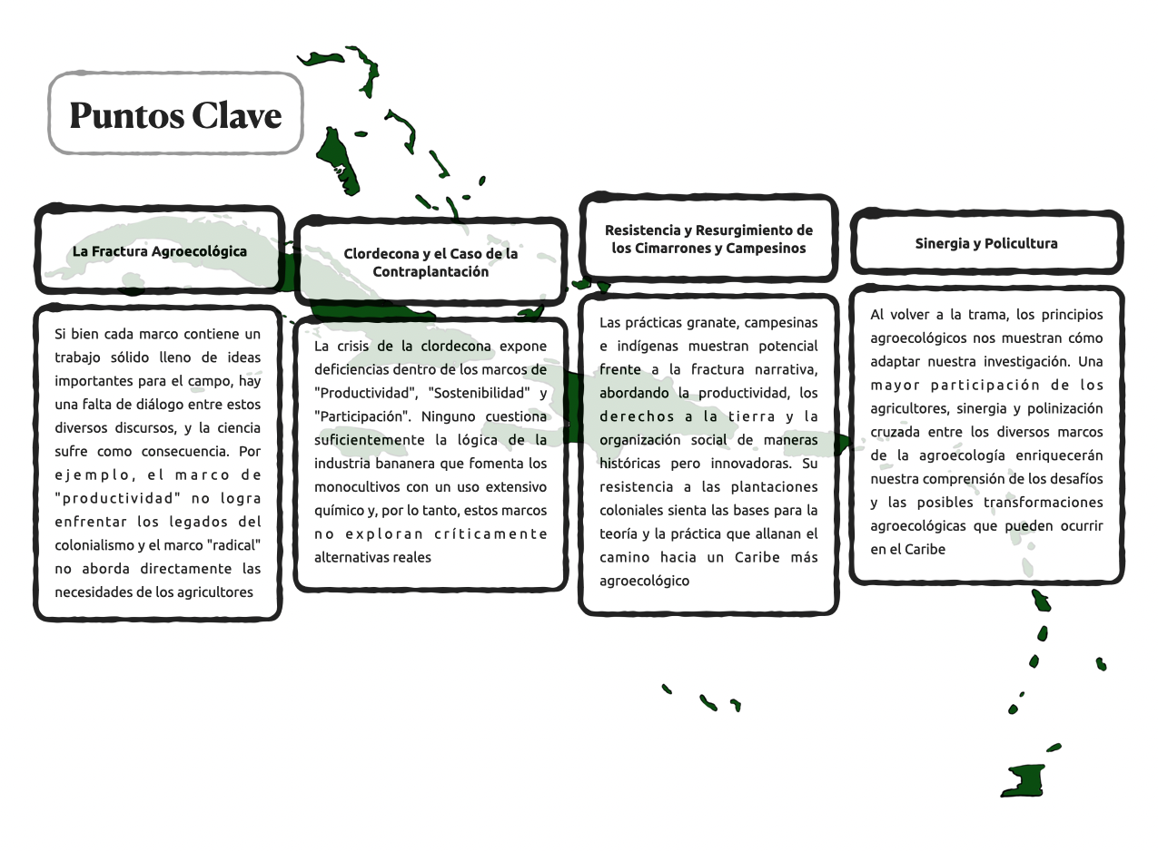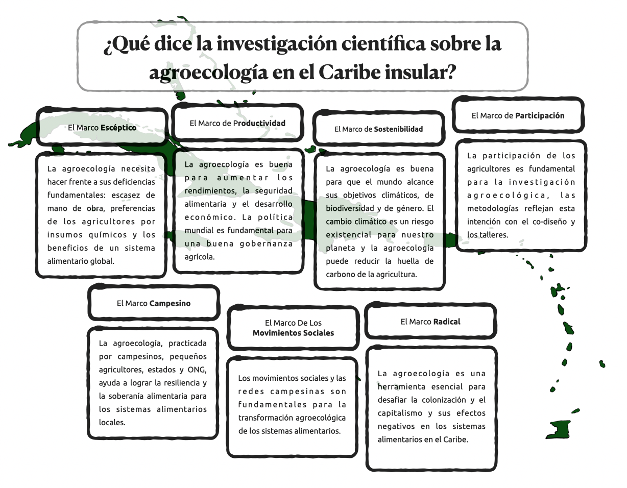 La agroecología, como un conjunto de principios influenciados por la ciencia, los movimientos sociales agrarios y las prácticas agrícolas ecológicas, ha demostrado que es posible diseñar sistemas alimentarios sostenibles y resistentes en todas las latitudes. A pesar de su potencial para reducir la vulnerabilidad a los peligros y los desafíos socioambientales, la agroecología rara vez se ha documentado en el Caribe Insular, una región conocida por su historia de plantaciones coloniales, frecuentes eventos climáticos y luchas políticas. Para entender cómo se enmarcan los discursos en torno a la agroecología en la literatura científica disponible, sintetizamos 128 publicaciones revisadas por pares, que mencionan el Caribe Insular, de la base de datos Scopus. Un análisis del marco reveló siete narrativas distintas, que van desde discursos escépticos y aquellos centrados principalmente en la productividad y la sostenibilidad, hasta aquellos centrados en la participación de los agricultores, los campesinos, los movimientos sociales y las nociones radicales de la agroecología. La fractura entre estos marcos conduce a un fracaso de la ciencia agroecológica para desafiar efectivamente las lógicas de las plantaciones dominantes a expensas de las perspectivas que subrayan el poder de la trama, las prácticas indígenas, el marrón, el intercambio de conocimientos y los movimientos sociales. Recomendamos diferentes policulturas de la investigación agroecológica, volviendo a la trama donde los marcos se integran mejor, y los discursos radicales y las metodologías participativas se polinizan y sinergizan con enfoques técnicos para apoyar las transformaciones agroecológicas de los sistemas alimentarios caribeños.
